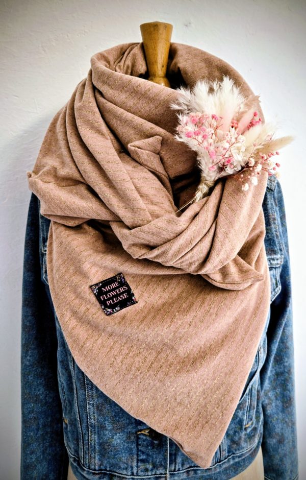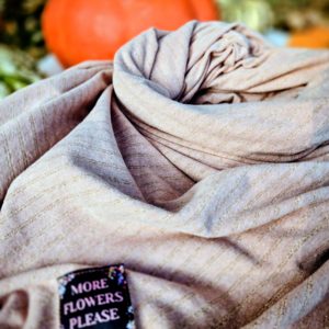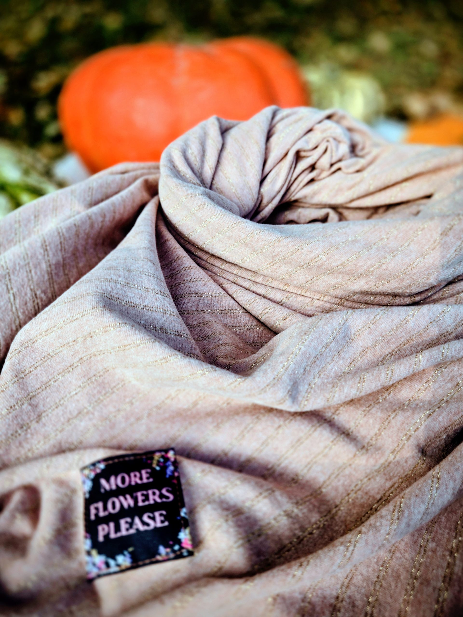 Matière | étiquette brodée More Flowers Please & tissu jersey doux vieux rose avec lurex pailleté |
