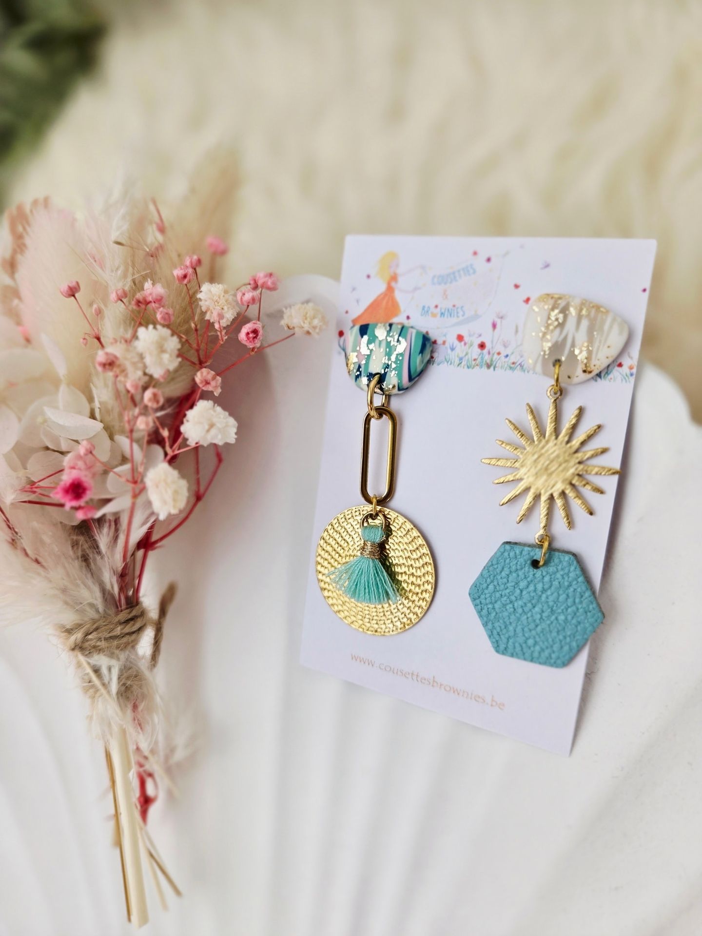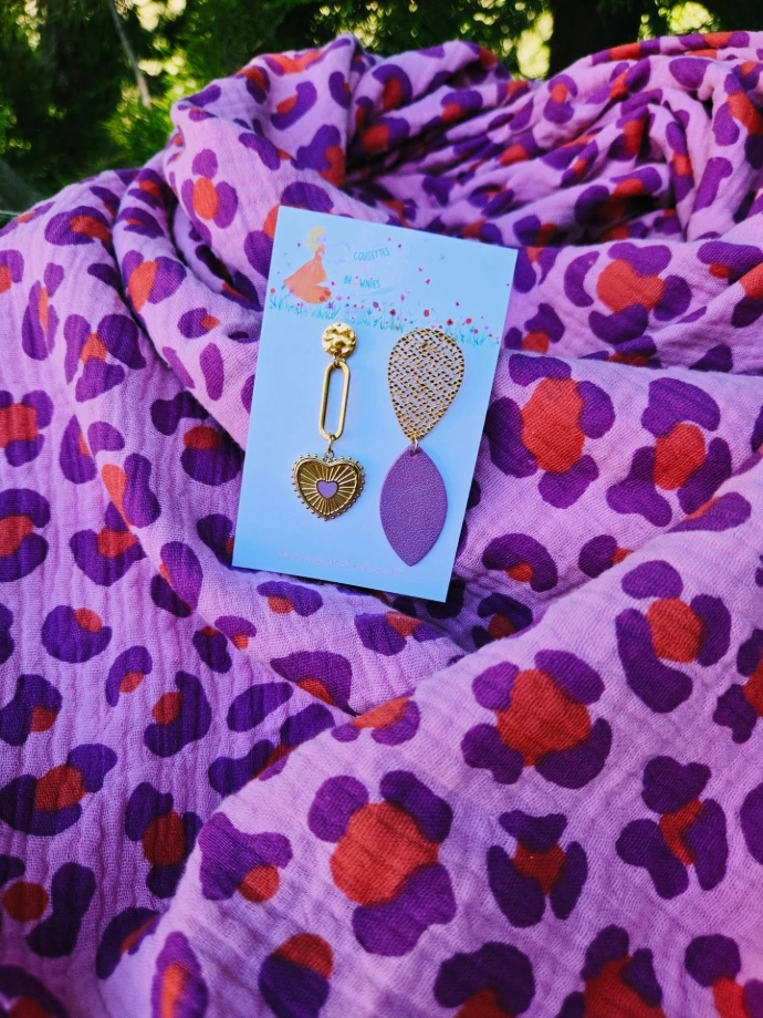 Boucles d'oreilles imaginées et pensées pour être directement assorties aux foulards. Assemblées à la main, une touche de cuir et surtout... jamais identiques! Adoptez le style asymétrique